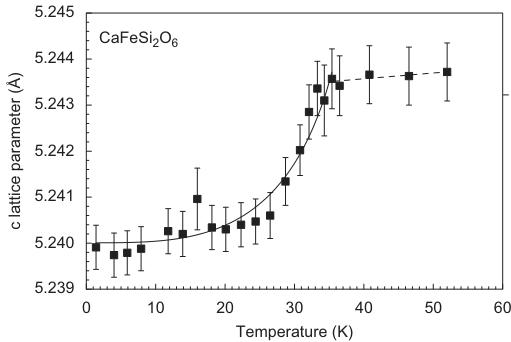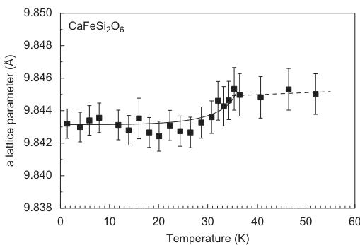 The evolution of lattice parameters as a function of temperature in hedenbergite is displayed in Fig. 3. Except for a, very prominent discontinuities are observable between 30 and 35 K. This shrinking of the lattice is related to the magnetic ordering of the sample, i.e. is the result of a distinct magnetostriction of the lattice. For neutron diffraction measurements on antiferromagnets, additional reflections appear at low temperatures below \( T_{N} \) . They can be indexed using the same unit cell as for the atomic