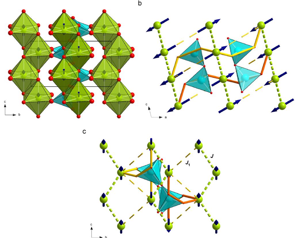 Fig. 5. Polyhedral representation of the atomic and magnetic structure of hedenbergite at 1.4K in a view onto the b-c plane (a); (b and c) give the possible magnetic interaction pathways with J = interaction within the chain and \( J_{1} = interaction between two neighbouring chains involving one tetrahedron, dashed lines correspond to the smallest distance between neighbouring M1 cations, the thick lines display the \( J_{1} \) interaction; only the \( Fe^{2+} \) cations and \( SiO_{4} \) tetrahedra are shown for clarity.