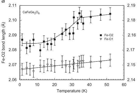 based solely on our experimental data. Theoretical calculations may shed some more light to this topic and are under progress. Generally, the Heisenberg model handles the spin as a 3D vector (dimensionality of the spin D = 3) thus allowing also spin canting, while the Ising model considers the z-component of the spin \( (D = 1) \) only and forces the spins to be strictly parallel/antiparallel pointing either "up" or "down" [36]. This dimensionality D of the spin-vector has to be distinguished from the dimensionality d of the lattice on which the spins sit and which can be 1, 2, etc. and which is d = 3 in the present case (3D ordering). The positive paramagnetic Curie temperature \( \theta_{P} \) in \( CaFeSi_{2}O_{6} \) (Table 1) shows that a strong FM coupling within the chains dominates over the weak AFM coupling between the chains. Indeed, in electronic and magnetic structure calculations found intra-chain coupling constants J of \( \sim+20~cm^{-1} \) (depending on cluster size), while the inter-chain coupling \( J_{1} \) is around \( -4~cm^{-1} \) [27], supporting the above statement. Some discussion exits concerning the inter-chain coupling. The exchange interaction \( J_{1} \) between two nearest M1 chains involves the edge of one \( SiO_{4} \) tetrahedron and is defined by the pathway Fe-O1-O1-Fe (Fig. 5), while another exchange interaction \( J_{2} \) is discussed involving two tetrahedra [18]. At 1.4 K the angles at the bridging oxygen atoms between the two chains are \( 149.7(1)^{\circ} \) and \( 121.8^{\circ} \) for the Fe-O1-O2 and O1-O2-Fe, respectively, both values consistent with an AFM coupling. As the magnetic phase transition has some distinct effects on unit cell dimensions of hedenbergite, it is of interest to look for discontinuities in structural parameters corresponding to these discontinuities. While the Fe–O1 bond lengths increase slightly and linearly between 1.4 and 52 K, the Fe–O2 bond length shows such a discontinuity across the magnetic phase transition (Fig. 6a). The O2 oxygen atom is involved in magnetic coupling between the chains. The Si–O bond lengths behave rigid and show no significant alterations with temperature, while the O3–O3–O3 bridging angle slightly increases with decreasing temperature in the magnetically ordered phase; i.e. the tetrahedral chain gets slightly more straightened with decreasing temperature. Small variations in Ca–O3 bond lengths can be related to the changes in the bridging angle of the tetrahedral chain.