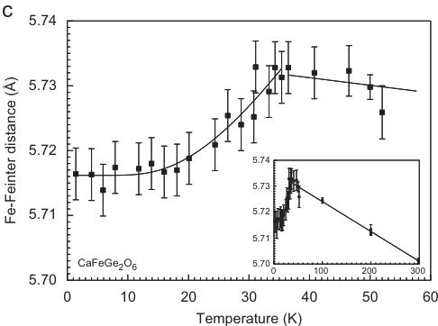 Fig. 6. Non-linear temperature-dependent variations of selected structural parameters at the magnetic ordering transition in hedenbergite \( CaFeSi_{2}O_{6} \) . (a) Two out of the three individual Fe–O bond lengths, (b) interatomic Fe–Fe distance within the M1 chain and (c) interatomic distance between two neighbouring M1 chains. Lines fitted to the data are guides to the eye only.