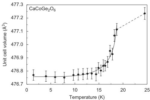 Fig. 7. Temperature dependence of the unit cell volume in synthetic \( CaCoGe_{2}O_{6} \) as extracted from the neutron diffraction data (lines fitted to the data are guides to the eye).