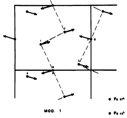 Configurations magnétiques observées. La seule structure compatible avec les intensités observées correspond à la représentation \(\Gamma 2\) (Tableau 5) Le groupe de Shubnikov est \(P_{2c}\) b'am'. Nous expliquons les intensités magnétiques observées, en admettant l'existence des modes \(-Cx+FY\) sur le site \(4h\) (43% de Fe), et \(+Cx-Fy\) sur le site \(4f\) (57% Fe). La faiblesse des intensités observées ne nous permet pas de trancher entre ces modes et \(-Cx+FY\) sur \(4h\) et \(-Cx+FY\) sur \(4f\). Les moments magnétiques sur les 2 sites font un angle de 15° avec l'axe des \(y\).
