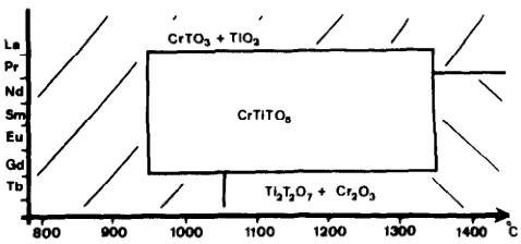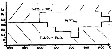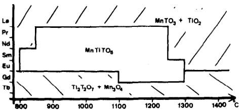 La poudre est analysée par rayons X. La Fig. 2 résume les résultats des produits obtenus en fonction des différentes terres rares et de la température. Nous obtenons les composés isomorphes de formule ATiTO \( _{5} \) avec les terres rares dont le rayon ionique est compris entre celui de Pr et de Gd inclus, dans des domaines de températures variables suivant le cation A \( ^{3+} \) mais en moyenne entre 1000° et 1300°C. Ces composés isomorphes à Mn \( _{2} \) TO \( _{5} \) sont en compétition avec deux autres structures, pyrochlore et pérovskite de formules respectives T \( _{2} \) Ti \( _{2} \) O \( _{7} \) et TAO \( _{3} \) .