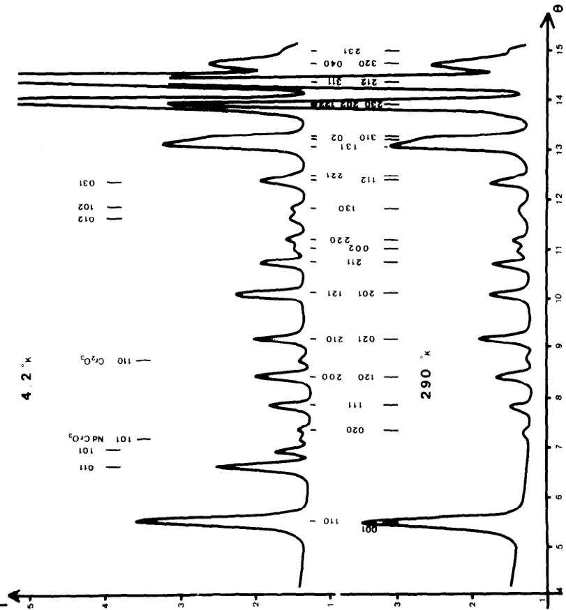 Nous en déduisons qu'à 30°K le \( Cr^{3+} \) n'est pas ordonné. Le diagramme à 4,2°K qui correspond à l'ordre du Cr et de la terre rare, permet d'observer des intensités magnétiques qui s'indexent dans la maille cristalline, donc k = 000.
