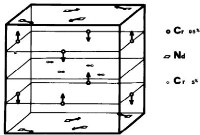 La deuxième remarque se rapporté aux interactions Cr–Nd Deux Cr en z=0,25 et -0,25 sont couplés entre eux par de fortes interactions négatives à 90°. Ces deux atomes de Cr sont de part et d'autre d'un plan d'atome de Nd (z=0) et les interactions par pont d'oxygène sont identiques, ils devraient donc se coupler de la même façon par rapport à Nd dans le cas d'interactions isotopes: or leurs moments étant opposés nous devons en conclure que les interactions Cr–Nd doivent être anisotropes et antisymétriques.