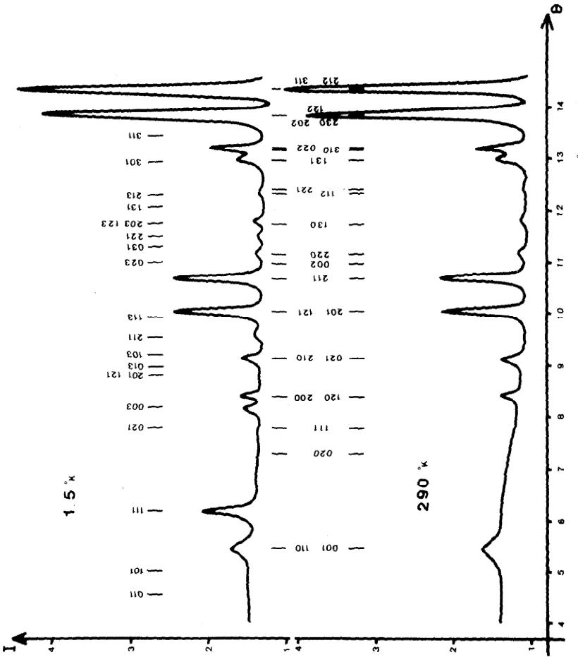 La Fig. 3 représente les diagrammes de neutrons à la longueur d'onde \( \lambda = 1,106 \) A enregistrés à la température ambiante et à 4,2°K.