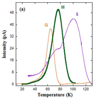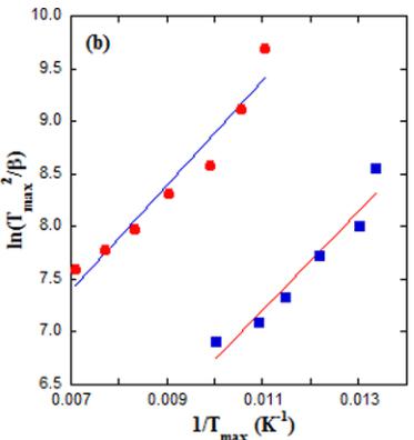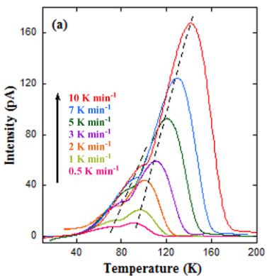 where \( U, k_{B}, \beta, \tau^{0} \) , and \( T_{max} \) stand for activation energy, Boltzmann constant, heating rate, relaxation time, and position of the TSDC peak maximum, respectively. Figure 13(b) shows that data from both peaks can be fitted to the formula in Eq. (1), yielding activation energies close to 0.05 eV in both cases.