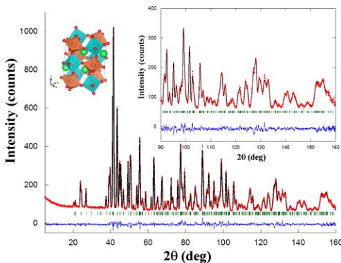 FIG. 1. Rietveld refinement of the neutron powder pattern of \( Y_{2}CoMnO_{6} \) (S sample) at 300 K. Points and line stand for experimental and calculated intensities, respectively. The difference is plotted at the bottom, and the row of bars indicates allowed reflections. The pattern was measured at D2B ( \( \lambda = 1.5914 \) Å), and according to [Ref. [24]], the reliability factors (%) are \( R_{wp} = 4.0 \) , \( R_{Bragg} = 3.3 \) , and \( \chi^{2} = 3.1 \) . Inset: (left) Polyhedral picture of the crystal structure. Big and small balls stand for Y and O atoms, respectively, while brown and blue octahedra refer to \( CoO_{6} \) and \( MnO_{6} \) (online); (right) detail of the same refinement at high angle (low q) region.