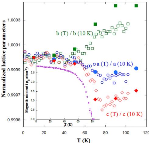 The temperature dependence of structural parameters and the onset for long-range magnetic ordering were determined using the data from D1B. The results are displayed in Fig. 5. Concurrent with the long-range ordering at the Curie temperature \( T_{C} \sim 80 \) K (see inset of Fig. 5), we observe changes in the unit cell. For the sake of comparison, the experimental lattice parameters were normalized to the value obtained at 10 K. The plot reveals that \( Y_{2}CoMnO_{6} \) exhibits an anisotropic magnetostriction at the magnetic transition. Whereas the b axis displays the typical contraction on cooling, the other two axes undergo a sudden expansion at \( T_{C} \) . This expansion seems