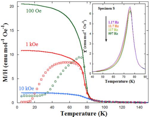 Magnetic measurements also reveal the occurrence of a magnetic transition in \( Y_{2}CoMnO_{6} \) with decreasing temperature. Figure 6 displays the temperature dependence of the dc magnetization for the S specimen under different magnetic fields in zero-field-cooled (ZFC) and field-cooled (FC) conditions. These measurements show a strong irreversibility, especially at low fields. At 100 Oe, the ZFC curve has an asymmetric peak at about 71 K, whereas the FC branch shows the usual shape of a FM transition. The calculated \( T_{C} \) from the inflection point is 76 K, and the onset of the transition is about 86 K. The temperature range for the ZFC/FC irreversibility decreases with increasing the external field, and the ZFC curve exhibits a broad bump for H = 1 kOe, while ZFC and FC branches are almost superposed for H = 10 kOe. This behavior is tentatively ascribed to the dynamics of magnetic domain walls as long-range FM ordering was clearly observed by neutron diffraction. However, a contribution from the magnetic anisotropy related to the temperature dependence of coercivity cannot be discarded. The magnetic transition was also characterized with ac magnetic susceptibility using different frequencies of the alternating field with amplitude of 4 Oe. The temperature dependence of the real part of the ac susceptibility \( \chi_{ac}^{\prime} \) is shown in the inset of Fig. 6. Here, \( \chi_{ac}^{\prime} \) shows a peak at \( T_{C} \) without significant frequency shift. The only dynamic behavior is a small decrease of the peak