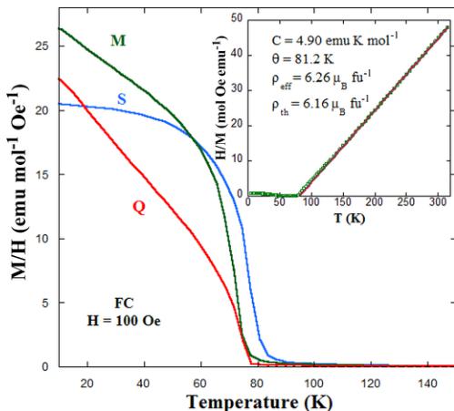 On the other hand, the details of the synthesis affect only weakly the value of \( T_{C} \) , as can be seen in Fig. 7. The calculated values from the inflection point are \( T_{C} = 72 \) and 71 K for M and Q specimens, i.e., a decrease of only about 5 K between the samples with almost perfect Co/Mn order (S sample) and almost random distribution (Q sample). The inverse of magnetic susceptibility is linear at high temperatures for all samples. An example is shown in the inset of Fig. 7, and the fitting of this linear part with the Curie-Weiss law \( 1/\chi_{\mathrm{dc}} = (T - \theta)/C \) yields the parameters summarized in Table II. The three samples exhibit similar paramagnetic effective moments ( \( \rho_{eff} \) ), slightly higher than