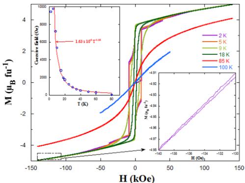 Hysteresis loops were measured at selected temperatures in the field range \( -140\ kOe \leqslant H \leqslant 140\ kOe \) and are shown in Fig. 8. The \( M(H) \) data measured at 18 K exhibit a typical FM hysteresis loop with a coercive field ( \( H_{C} \) ) of 1933 Oe. However, magnetic saturation is not achieved even at very high magnetic fields (140 kOe). Moreover, below 20 K, the magnetization value at the highest field ( \( \sim5\ \mu_{B}\ f.u.^{-1} \) ) does not vary significantly with decreasing temperature. The most important change observed in the loops with decreasing temperature is a strong increase in \( H_{C} \) . The inset of Fig. 7 shows the temperature dependence of \( H_{C} \) , and we found that it follows a power law, \( H_{C} \propto T^{-\sim3/2} \) , between 8 K \( \leqslant T \leqslant 75 \) K. Below 8 K, \( H_{C} \) seems to saturate at a value of \( \sim9600 \) Oe. The striking point is the occurrence of strong jumps in the loops. These jumps or steps were reported to depend on the field sweep rate and field-cooling conditions [14,32]. Specifically, the steps in a nominal \( Y_{2}CoMnO_{6} \) sample (with unknown ASD) studied in [Ref. [32]] were attributed to the sharp