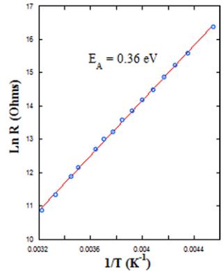 three elements in parallel (see inset in Fig. 10): a bulk dc resistance (R1), the high frequency limit of the bulk capacitance (C1), and a constant phase element (CPE1) to account for the hopping conductivity contribution of the localized charge carriers (ac conductivity) [43]. The second semicircle is modeled with another RC element, representing the extrinsic resistance (R2) and capacitance (C2), connected in series with the bulk element. The bulk resistance extracted from this analysis follows an activated behavior, as can also be seen in Fig. 11. The data have been fitted to an Arrhenius law yielding activation energy of 0.36 eV, in agreement with the values obtained for related compounds by the four-probe configuration [16]. Here, C1 has values about 70 pF at room temperature and almost independent of the temperature down to 200 K. The capacitance values are in agreement with the ones observed in polycrystalline ceramics with grain boundaries contributions [42].