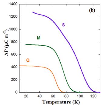 We also measured the obtained polarization for various poling fields with a heating rate of \( 5 \, K min^{-1} \) , as can be seen in Fig. 13(c). From these results, we can extract the P versus electric field (E) curves at different temperatures. Figure 13(d) shows a linear relationship at low electric fields. Such a linear dependence is ascribed to relaxation of defect dipoles, whereas the release of trapped charges follows an exponential relationship [44]. Therefore, the pyroelectric currents in \( Y_{2}CoMnO_{6} \) should be ascribed to TSDC that are likely due to defect dipole reorientation. A plausible mechanism could be similar to that reported [48] for Fe-doped \( SrTiO_{3} \) , where it has been suggested that the defect dipole pair consists of a \( Fe^{3+} \) substituting the \( Ti^{4+} \) site and the compensating oxygen vacancies. In a similar way, ASDs occur naturally in \( Y_{2}CoMnO_{6} \) yielding APBs, and it is precisely at the APB where it is more likely to develop compensating vacancies. In this case, it may be counterintuitive that the sample with fewer ASDs presents the highest P magnitude at the highest temperature, but one must take into account that Co/Mn cationic disorder also affects the coherent formation of APBs and the homogeneous distribution of them. In this way, uniform distribution of APBs in the S specimen is consistent with the sharp transitions in the magnetic hysteresis loops due to the flip of entire magnetic domains. Regarding chemical composition of APBs, the right stoichiometry imposes the same ratio of Co-rich and Mn-rich APBs in the sample. Different compensating vacancies are expected for them. In the first case, \( Co^{2+} \) is occupying the \( Mn^{4+} \) site, so oxygen vacancies are expected. In the second one, \( Mn^{4+} \) substitutes the \( Co^{2+} \) site, so cationic vacancies are more likely. This might be the explanation for the emergence of two peaks in the