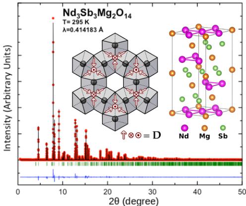 \(\mathrm{Nd}_{3}\mathrm{Sb}_{3}\mathrm{Mg}_{2}\mathrm{O}_{14}\) is isostructural to three recently reported compounds, \(\mathrm{Er}_{3}\mathrm{Sb}_{3}\mathrm{Mg}_{2}\mathrm{O}_{14}\), \(\mathrm{Dy}_{3}\mathrm{Sb}_{3}\mathrm{Mg}_{2}\mathrm{O}_{14},\) and \(\mathrm{Gd}_{3}\mathrm{Sb}_{3}\mathrm{Mg}_{2}\mathrm{O}_{{14}}\) [22], which also form crystallographically ideal ordered kagome lattices. An isostructural series based on Zn in place of Mg was also recently communicated [23]. This Rapid Communication reports the determination of a magnetic ordered structure in this family of materials. This compound can also be compared to the jarosites, which form ideal ABC stacked kagome lattices [9] with semiclassical spins and long-range magnetic order [24–26], and the langasites, which have “breathing” rare-earth kagome lattices with long-range interactions leading to incommensurate magnetism [27,28].