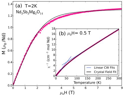 Polycrystalline \( Nd_{3}Sb_{3}Mg_{2}O_{14} \) was synthesized from a stoichiometric mixture of \( Nd_{2}O_{3} \) , \( \mathrm{Mg(OH)_{2}} \) , and \( Sb_{2}O_{3} \) using standard solid state methods. To determine the crystal structure, high-resolution x-ray powder diffraction data were acquired at room temperature using beamline 11-BM at the Advanced Photon Source (APS) at Argonne National Laboratory ( \( \lambda = 0.414183 \) Å) and analyzed through the Rietveld method as implemented in FULLPROF [29]. The magnetic susceptibility of \( Nd_{3}Sb_{3}Mg_{2}O_{14} \) was measured between 1.8 and 300 K in a Quantum Design Physical Properties Measurement System (PPMS) in an applied field of 0.5 T [30]. The magnetization was found to be proportional to the magnetic field for all temperatures above 1.8 K and fields less than 1 T. Therefore \( M/H \) at \( \mu_{0}H = 0.5 \) T was used as a measure of the susceptibility. The heat capacity \( C(T) \) was measured between 0.1 and 300 K in zero applied magnetic field in a PPMS equipped with a Quantum Design dilution refrigerator [30]. The sample was a dense polycrystalline pellet with a mass of 0.72 mg.