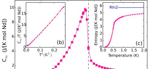 Our first aim is to establish the nature of the spin Hamiltonian in \( Nd_{3}Sb_{3}Mg_{2}O_{14} \( through high-temperature and high-field measurements. Figure 2(b) shows the temperature dependence of the inverse susceptibility. Curie-Weiss fits in the low T and high T ranges yield effective moments of \) \mu_{\mathrm{eff}}(1.8\ \mathrm{K}<T<10\ \mathrm{K})=2.50(5)\mu_{B} \( and \) \mu_{\mathrm{eff}}(150\ \mathrm{K}<T<300\ \mathrm{K})=3.56(5)\mu_{B} \( . The latter value is similar to the free ion value of \) g_{J}\sqrt{J(J+1)}\mu_{B}=3.62\mu_{B} \( for the J=9/2 multiplet of \) Nd^{3+} \( . The ratio between the high and low T effective moments is 0.70(2), which is consistent with the value of \) 1/\sqrt{2}\approx0.707 \( for an easy-plane ion in the large J limit with a random orientation distribution. Similar low T effective moments have been observed for several other easy-plane neodymium pyrochlore oxides, such as \) Nd_{2}ScSbO_{7} \( (2.58 \( \mu_{B} \) ), \( Nd_{2}Pb_{2}O_{7} \) (2.55 \( \mu_{B} \) ), \( Nd_{2}Zr_{2}O_{7} \) (2.54 \( \mu_{B} \) ), and \( Nd_{2}Sn_{2}O \) (2.63 \( \mu_{B} \) ) [33–36]. The energy scale (Curie-Weiss temperature) extracted from the high T fit \( \Theta(150\ \mathrm{K} FIG. 2. Magnetization data for a powder sample of \( Nd_{3}Sb_{3}Mg_{2}O_{14} \) . (a) Magnetization as a function of applied field. (b) Inverse susceptibility H/M in an applied field of 0.5 T. The blue lines are linear fits to distinct T ranges. For \( 1.8~K < T < 10~K \) we find an effective moment of \( 2.50(5)\mu_{B} \) and a Curie-Weiss temperature \( \Theta_{\mathrm{CW}} = -0.12(1) \) K. The higher-temperature fit for \( 150~K < T < 300~K \) yields the full effective moment of \( 3.56(5)\mu_{B} \) and a large negative intercept of -54.5(5) K, which is indicative of the crystal-field energy scale. The black lines are a single consistent fit to the data in (a) and (b) based on a mean-field model described in the text. Weiss fit, we extract an estimate for the sum of all exchange constants associated with each Nd site of \( \Theta(1.8\;\mathrm{K} To quantify anisotropy and exchange parameters, a consistent fit was carried out to \( \chi(T) \) and \( M(H) \) based upon the following mean-field Hamiltonian: \( \mathcal{H}=D_{\mathrm{CF}}J_{z}^{2}+g_{J}\mu_{B}\mu_{0}\mathbf{H}_{\mathrm{eff}}\cdot\mathbf{J} \) . Here \( D_{CF}>0 \) represents the crystal-field easy-plane anisotropy energy, and \( g_{J} \) is the Landé factor. The effective field is \( \mathbf{H}_{\mathrm{eff}}=(H+\lambda M)\hat{\mathbf{H}} \) where \( H=H\hat{H} \) is the applied field, M the induced magnetization per volume unit, \( \lambda=(V/N)(g_{J}\mu_{B})^{-2}\mathcal{J}_{\mathrm{tot}} \) , and \( \mathcal{J}_{\mathrm{tot}}=(1/2N)\Sigma_{ij}\mathcal{J}_{ij} \) is the total exchange energy per spin. The corresponding fitted parameters are \( D_{CF}=28.5(3) \) meV, \( g_{J}=0.7235(9) \) , and \( \mathcal{J}_{\mathrm{tot}}=-23(1)\mu\mathrm{eV} \) . The excellent and consistent description of the data (solid lines in Fig. 2) and consistency with \( g_{J}=0.7273 \) for the \( Nd^{3+} \) ion indicate the low-temperature magnetism of \( Nd_{3}Sb_{3}Mg_{2}O_{14}} \) can be described in terms of FIG. 3. (a) Low-temperature heat capacity of \( Nd_{3}Sb_{3}Mg_{2}O_{14} \) . The low T upturn results from hyperfine enhanced nuclear heat capacity from \( {}^{143}Nd \) and \( {}^{145}Nd \) . The dashed line shows calculated nuclear contribution with a fitted ordered Nd moment of \( 1.5(1)\mu_{B} \) . (b) \( C_{m}/T \) versus \( T^{2} \) after subtracting the low T nuclear contribution to the heat capacity. (c) Change in electronic entropy obtained through an integral of \( C_{m}/T \) . (d) Integrated intensity of the (101) peak versus T along with several fits using various critical exponents \( \beta \) while fixing \( T_{N} \equiv 0.56 \) K as determined from the heat capacity data (vertical dashed line). (e) Integrated intensity versus \( T^{3} \) in the low T regime where the reduction in sublattice magnetization is given by spin wave theory to be \( \propto T^{3} \) . Error bars represent one standard deviation. an easy-plane Kramers doublet with net antiferromagnetic interactions. Turning to collective phenomena, Fig. 3(a) shows low-temperature heat capacity data. Below 0.6 K, the heat capacity strongly increases, with an inflection point at 0.56(2) K. The \( \lambda \) -like anomaly indicates a second-order phase transition at \( T_{N}=0.56(2) \) K, which we shall shortly show is to a three-dimensional long-range-ordered canted antiferromagnetic state that carries a finite scalar chirality. The lattice contribution to heat capacity was removed by subtracting the heat capacity of a nonmagnetic analog, \( La_{3}Sb_{3}Mg_{2}O_{14} \) . For temperatures below 0.2 K a slight upturn in \( C(T) \) is ascribed to a hyperfine field enhanced nuclear Schottky anomaly. The dashed line in this T regime was fit based on this hypothesis and the known hyperfine parameters [37] for the stable spin-full isotopes of neodymium (12.18% \( {}^{143}Nd \) and 8.29% \( {}^{145}Nd \) both with spin- \( \frac{7}{2} \) ) and indicates an ordered Nd moment of \( 1.5(1)\mu_{B} \) . By integrating C/T, the T-dependent change in entropy (computed after subtracting the nuclear Schottky contribution to the heat capacity) was inferred [Fig. 3(c)]. While significant FIG. 4. Rietveld refined neutron diffraction data for \( Nd_{3}Sb_{3}Mg_{2}O_{14} \) (a) Low T data along with images of the corresponding scalar chiral umbrella-like spin structure. (b) Magnetic diffraction data at \( T = 0.1~K \) isolated from nuclear scattering by subtracting nuclear diffraction data acquired at \( T = 0.8~K > T_{N} \) . entropy is liberated at the magnetic phase transition, the amount falls short of R ln 2 anticipated for a ground state doublet. Neglecting any low T configurational entropy, this indicates significant spin correlations for \( T > T_{N} \) K. Figure 3(b) sh
