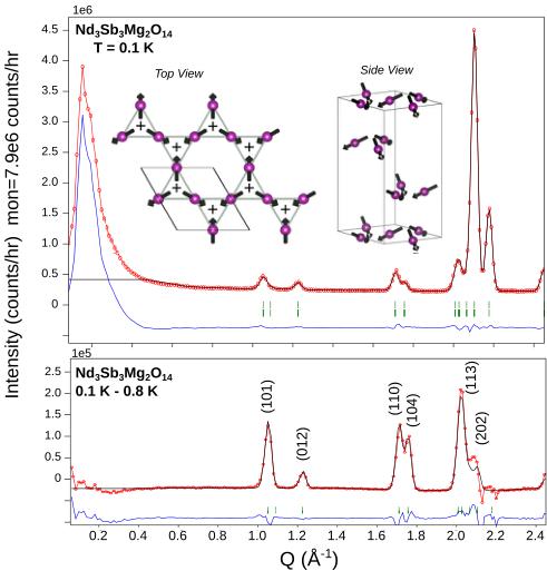 To investigate the magnetic order of \( Nd_{3}Sb_{3}Mg_{2}O_{14} $ , neutron diffraction measurements were carried out on MACS at the NCNR [31]. The monochromator was set for vertical focusing of 5 meV neutrons and the horizontal beam divergence was defined by a 50-mm-wide beam aperture before the monochromator and the 20 mm sample diameter to be 1.5°. 10.2 g of loose \( Nd_{3}Sb_{3}Mg_{2}O_{14} \) powder was loaded into an aluminum can under 10 bars of helium gas at room temperature. The can was closed with an indium sealed copper lid and cooled to the 50 mK base temperature of a KelvinOx-100 dilution fridge with 100 \( \mu \) W cooling power at 100 mK [30]. A 0.02 Tesla magnetic field was applied throughout to maintain aluminum in the normal state. We acquired diffraction data for 24 h at base temperature ( \( T < 0.1 K \) ) and for 24 h at \( T = 0.8 K \) . The neutron diffraction data were analyzed using the FULLPROF [29] and SARAH [32] programs.