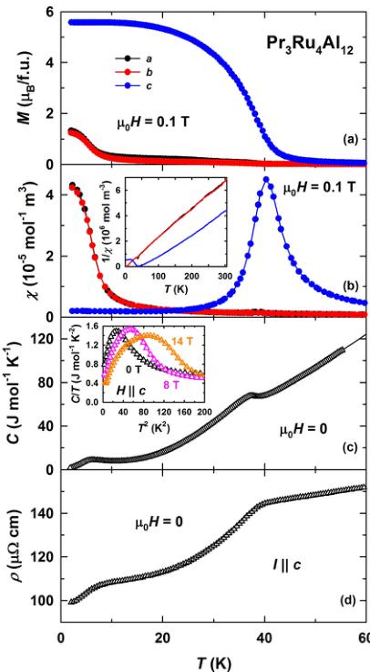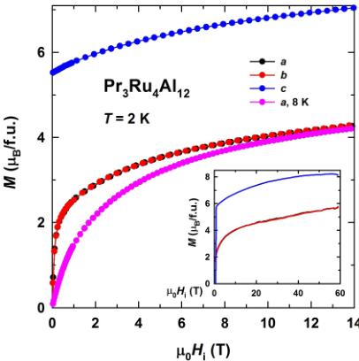 For \( Pr_{3}Ru_{4}Al_{12} \) ,the anisotropy of the Pr1 site is uniaxial. For Pr2, there are competing contributions to the magnetic anisotropy, most likely due to the presence of higher-order terms in the anisotropy energy. With increasing temperature from the ground state, their contribution usually falls off more rapidly than the lower-order contribution [55,56]. We expect that the higher-order terms tend to zero around \( T_{sf} \) and the uniaxial term will become the dominant contribution to the anisotropy above \( T_{sf} \) , where the magnetic anisotropy of the Pr2 site is uniaxial, similar to Pr1.