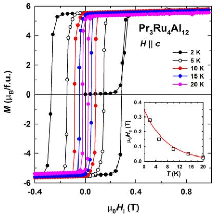 FIG. 4. Hysteresis loops for field applied along the c axis of \( Pr_{3}Ru_{4}Al_{12} \) between 2 and 20 K. The inset shows the temperature dependence of the coercivity, where the solid line is a fit explained in the text.