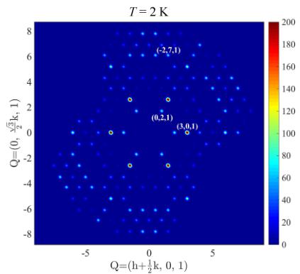 FIG. 5. Integrated intensities in the \( (hk1) \) planes of a \( Pr_{3}Ru_{4}Al_{12} \) single crystal from neutron diffraction taken at 50, 10, and 2 K (represented in orthogonal axes).