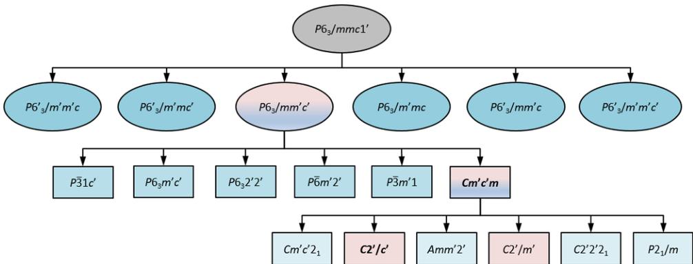 FIG. 7. Hierarchy of the group-subgroup relations descending from the paramagnetic phase with space group \( P6_{3}/mmc1' \) for a magnetic ordering with the propagation vector k=0. The elliptical frames indicate the k-maximal magnetic space groups. Only subgroups of the \( P6_{3}/mmc' \) and of \( Cm'c'm \) magnetic space groups are shown in the third and fourth rows, respectively. The groups tested at 2 and 10 K are indicated with a different color (bicolor if tested at both temperatures and pink if tested only at 2 K). The groups that best describe the magnetic configuration at each temperature are emphasized in bold.