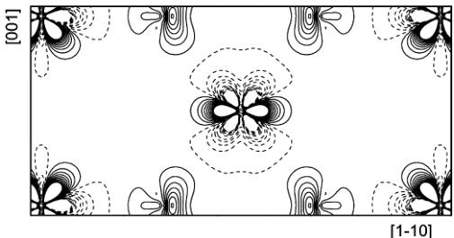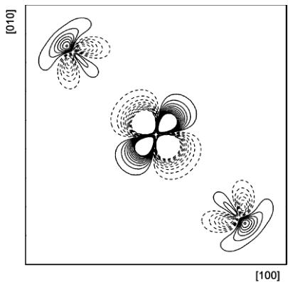 Aspherical contributions to the static model density in the \( (1\bar{1}0) \) plane. Contours as in Fig. 1. The density range is from -3.95 to 3.63 e \( \mathring{A}^{-3} \) . Co is located at the centre and at the corners of the map.