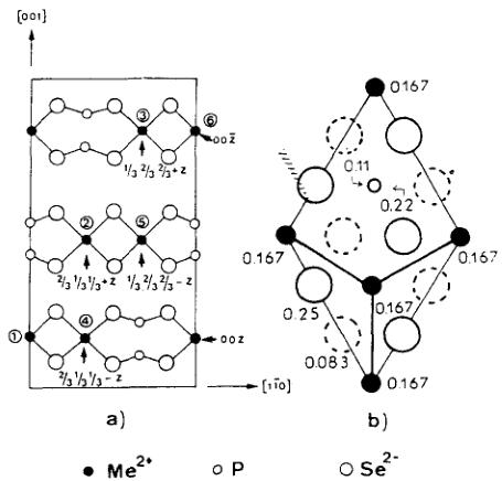Fig. 1. Rhombohedral structure of the \( MnPSe_{3} \) phases. (a) in the (110) plane; (b) in the (001) plane: numbers represent the position along the c-direction in reduced unit.
