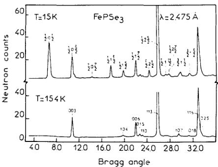 In the case of \( FePSe_{3} \) many superlattice peaks appear below \( T_{N}=119\pm1K \) (Fig. 2). They are indexed with a vector \( k=[1/2\ 0\ 1/2] \) which is a symmetry point