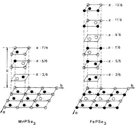 THE INSULATING COMPOUNDS \( MnPSe_{3} \) and \( FePSe_{3} \) belong to the layered \( MPX_{3} \) family (M = first row transition metal, X = S, Se). The manganese and iron selenophosphates can be considered as two-dimensional \( MSe_{2} \) layers of the \( CdJ_{2} \) type in which one third of the cations have been substituted by \( (P_{2}) \) pairs. The stacking of the \( SeM_{2/3}(P_{2})_{1/3}Se \) slabs give rise to Van der Waals' gaps, and it has been shown [1-5] that ions or molecules can easily be intercalated in the voids of the gap.