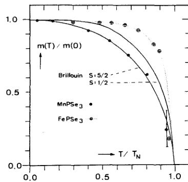 Fig. 4. Thermal variation of the reduced magnetic moments in \( MnPSe_{3} \) and \( FePSe_{3} \) determined from magnetic intensities. Full lines represent Brillouin functions for S = 5/2 and 1/2.