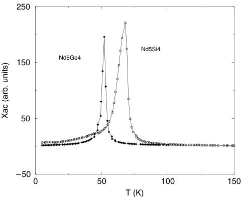 The \( Nd_{5}Si_{4} \) and \( Nd_{5}Se_{4} \) samples were prepared in a tri-arc furnace with a base pressure less than \( 6 \times 10^{-7} \) mbar. Stoichiometric amounts of the pure elements were melted several times under Ti-gettered argon to ensure homogeneity. Powder x-ray diffraction patterns were obtained using Cu Kα radiation on an automated Nicolet-Stoe diffractometer. Ac susceptibility was measured on a Quantum Design PPMS at a frequency of 377 Hz and an ac magnetic field amplitude of \( 398 \, A m^{-1} \) . No dc bias fields were applied during the susceptibility experiments.