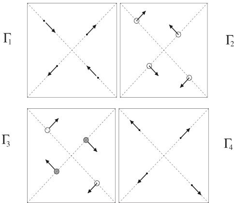 Figure 3. Possible magnetic structures of the Nd 4a site in \( Nd_{5}Si_{4} \) projected onto the tetragonal a–b plane. \( \Gamma_{1} \) and \( \Gamma_{4} \) are planar whereas \( \Gamma_{2} \) and \( \Gamma_{3} \) have components along the c-axis, as denoted by the filled or unfilled circles which represent components either into the plane or out of the plane.