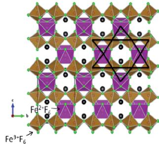 † Electronic supplementary information (ESI) available: X-Ray crystallographic files in CIF format, experimental and calculated powder X-ray diffraction patterns, Infrared and UV-vis spectra, thermogravimetric and differential thermal analysis diagrams, and additional theoretical calculations. CCDC reference number 847959. For ESI and crystallographic data in CIF or other electronic format see DOI: 10.1039/c2sc00765g K_{3}Fe_{5}F_{15} and K_{3}Cu_{3}Fe_{2}F_{15} have been shown to be ferri- and anti-ferromagnetic respectively, whereas K_{3}Cr_{2}Fe_{2}F_{15} exhibits relaxor-like magnetic transitions. Although full structural data is lacking for the quaternary phases, multiferroic behavior is suggested. \( ^{15,16} \) It should also be noted that in K_{3}Cu_{3}Fe_{2}F_{15} and K_{3}Cr_{2}Fe_{2}F_{15}, the Cu^{2+}/Fe^{3+} and Cr^{3+}/Fe^{2+} cations, respectively, are crystallographically disordered.