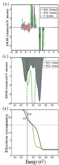 From these total energy calculations the exchange integrals were extracted. All were found to be antiferromagnetic in nature within both GGA and GGA + U methods as listed in Table 9. For GGA the third coupling, \( J_{3} \) , which is the coupling between two NN \( Fe^{2+} \) (Fe(1)) and \( Fe^{2+} \) (Fe(2)) ions through F(1) ion, is found to be the strongest. The second strongest coupling is \( J_{4} \) , which accounts for the coupling between two NN \( Fe^{2+} \) ions mediated via F(3) ion, is 0.85 of \( J_{3} \) . However within GGA + U, this \( J_{4}/J_{3} \) ratio gets enhanced with the increase of U and becomes >1.0 for \( U_{eff} > 2.0 \) eV. The coupling between two NN \( Fe^{2+} \) ions, \( J_{1} \) , and the coupling between two NN \( Fe^{2+} \) and \( Fe^{2+} \) mediated via F(2) ion, \( J_{2} \) , remain smaller than \( J_{3} \) and \( J_{4} \) (for the whole range of U). These results indicate that the magnetic frustration is partially lifted by the orthorhombic distortion, but not completely, as \( J_{1} \) and \( J_{2} \) are not negligible compared to \( J_{3} \) and \( J_{4} \) . This residual frustration is therefore a hindrance to achieve a collinear AFM ordering for the system and likely leads to a non-collinear AFM state governed by the strongest exchange integrals.