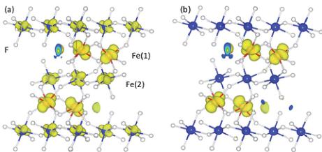 Table 8 Eight spin configurations of the Fe ions within the orthorhombic unit cell used to determine the lowest energy collinear spin configuration and the magnetic exchange integrals, \( J_{1}-J_{4} \) (as described in Fig. 11a and b), where \( E1 = -J_{1}S_{1}S_{1} \) , \( E2 = -J_{2}S_{1}S_{2} \) , \( E3 = -J_{3}S_{1}S_{2} \) and \( E4 = -J_{4}S_{2}S_{2} \) . \( S_{1} \) and \( S_{2} \) represent the spin of Fe(1) and F(2), respectively; + and - signs correspond to spin up and down respectively. Numbering of the magnetic ions follow Fig. 11b. In the last two columns the calculated total energies of the collinear spin configurations obtained using GGA and GGA + U method with \( U_{eff} = 6.0 \) eV are given respectively, with respect to the spin configuration 1, where all spins are pointing along same direction.