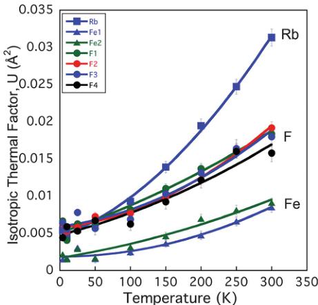 Powder neutron diffraction measurements were performed on \( RbFe_{2}F_{6} \) at several temperatures in the range 4–300 K. Fig. 3 shows the typical quality of fit to the observed data with this model, as obtained at 300 K, resulting in goodness-of-fit factors of \( wR_{p} = 4.49 \) and \( \chi^{2} = 1.29 \) . One key feature of \( \beta \) -pyrochlores that has greatly hindered their usefulness as model magnetic systems is their tendency for both site disorder and partial