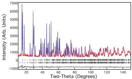 Powder neutron diffraction was performed on the BT1 high-resolution diffractometer at the NIST Center for Neutron research. Data were collected using a Ge (311) monochromator at \( \lambda = 2.0782 \) Å and a (311) monochromator at \( \lambda = 1.5401 \) Å, with an in-pile collimation of 15'. Rietveld refinements were performed using the FULLPROF suite of programs. \( ^{[38]} \) Cooling was performed with a closed cycle refrigerator and measurements were performed at 4, 10, 25, 50, 100, 150, 200, 250 and 300 K.