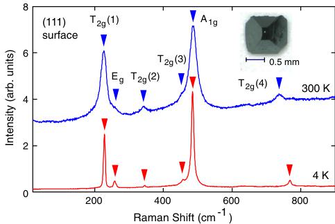 FIG. 1 (color online). Raman spectra at 300 and 4 K on the (111) surface of a \( Cd_{2}Os_{2}O_{7} \) single crystal in parallel polarization. The inset shows a single crystal of \( Cd_{2}Os_{2}O_{7} \) .