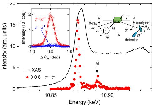 Figure 2 shows the spectra near the Os L3 edge of x-ray absorption and the intensity of the 006 reflection at 10 K. The 006 reflection was obtained in the \( \pi - \sigma' \) channel at \( \psi = -47^{\circ} \) ; thus, the contribution of the ATS scattering must be vanishingly low. The maximum of the 006 reflection is in good agreement with the Os L3 edge, as depicted by the dotted line, implying an enhancement by the resonance effect. The small peak marked by M is induced by multiple scattering. The left inset of Fig. 2 shows the polarization dependence of the 006 reflection at 10 K without the ATS contribution. The intensity in the \( \pi - \sigma' \) channel at \( \psi = 47^{\circ} \) is 20 times as large as that in the \( \pi - \pi' \) channel at \( \psi = 0^{\circ} \) ; the weak intensity in the \( \pi - \pi' \) channel is ascribed to a leakage component from the \( \pi - \sigma' \) channel, which can appear because the \( 2\theta \) value of the polarizer is not precisely \( 90^{\circ} \) . Thus, the 006 reflection appears in only the \( \pi - \sigma' \) channel, indicating magnetic scattering in origin. We therefore conclude that a commensurate magnetic structure appears at the propagation vector q = 0 at low temperature.