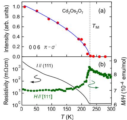 FIG. 3 (color online). (a) Temperature dependence of the integrated intensity of the 006 magnetic reflection measured in the \( \pi - \sigma' \) channel at \( \psi = -\frac{47^{\circ}}{2} \) . Upon cooling, it increases gradually below \( T_{MI} = 227 \) K following a power law of temperature, indicating a second-order transition. (b) Resistivity in a zero magnetic field and magnetic susceptibility in \( H = 20 \) kOe measured after zero-field cooling, both of which show clear anomalies at \( T_{MI} \) .