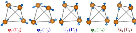 FIG. 4 (color online). Spin arrangements on a regular tetrahedron for selected basis functions \( \Psi_{i} \) with i = 1, 2, 3, 4, and 8 and the corresponding irreducible representations \( \Gamma_{s} \) . All of them are noncollinear antiferromagnetic spin arrangements. Only the all-in-all-out \( \Psi_{1} \) indicates cubic magnetic symmetry; the other antiferromagnetic basis functions indicate tetragonal magnetic symmetry.