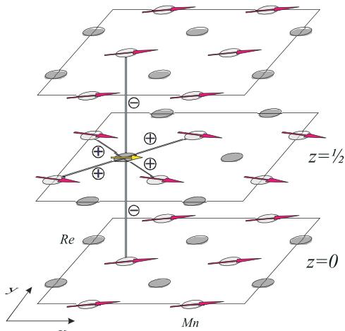 Figure 4. Schematic illustration of the origin of frustration for the y component of the Re moment. For clarity only x (FM) and y (AFM) components of the magnetic moments are shown.