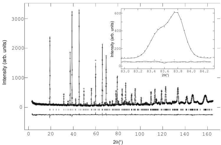Neutron powder diffraction data were collected using the high-resolution BT-1 32 detector neutron powder diffractometer at the NIST Center for Neutron Research. The sample was sealed in a vanadium container inside a dry He-filled glove-box. A closed-cycle He refrigerator was used for temperature control. A \( \mathrm{Cu(311)} \) monochromator with a \( 90^{\circ} \) take-off angle, \( \lambda = 1.5402(1) \) Å, and in-pile collimation of 15 min of arc were used. Data were collected over the range of \( 3^{\circ}-168^{\circ} \) \( 2\theta \) with a step size of \( 0.05^{\circ} \) . The instrument is described in the NCNR Website (http://www.ncnr.nist.gov/). An external magnetic field was produced by a CT-MAG bottom-loading vertical field magnet. The GSAS program [3] with the EXPGUI interface [4] was used for the Rietveld analysis.