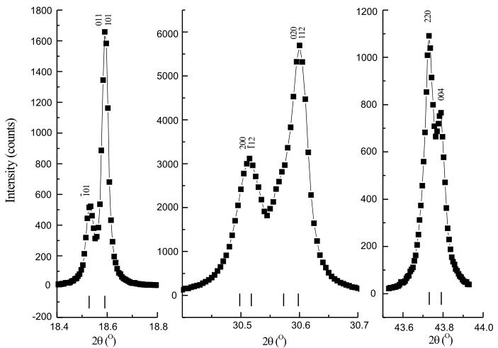 \( Sr_{2}MnReO_{6} \) was previously reported as an undistorted double perovskite structure (space group \( Fm\overline{3}m \) ) based on laboratory PXD data [2]. However, the room temperature (RT) ND spectrum showed split reflections and superlattice peaks, consistent with a primitive monoclinic lattice (figure 1(a)). The same splitting pattern is observed in the 8 K SXD data (figure 1(b)), and a Rietveld refinement of the crystallographic model described below is in good agreement with both RT ND data and 8 K SXD data.