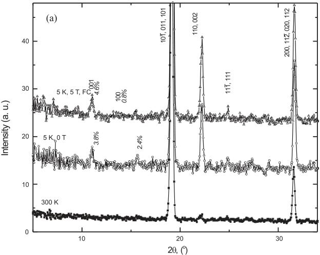 Figure 2. (a) Low-angle region of powder neutron diffraction profiles of \( Sr_{2}MnReO_{6} \) at 300 and 5 K, without field and field-cooled in 5 T with reflection indices in the monoclinic setting. The intensities were normalized to that of \( (440)_{\mathrm{c}} \) peak at \( \sim66^{\circ} \) with a predominantly nuclear contribution. Relative intensities of the two low-angle peaks are shown. (b) Neutron diffraction difference pattern showing the contribution from the magnetic scattering.