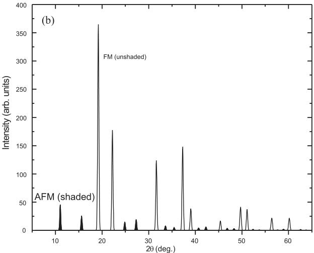The most significant magnetic intensity is in the \( (110/002)_{\mathrm{m}} = (200)_{\mathrm{c}} \) reflections (subscripts m and c refer to the 'true' monoclinic and parent cubic structures, respectively). This shows unambiguously that the dominant contribution is FM (figure 2(b)), and the intensity is consistent with the Mn sublattice as a primary origin.