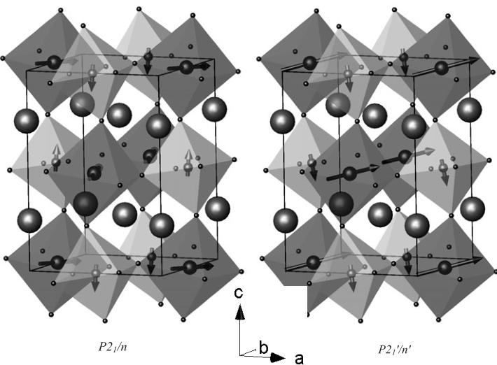 The high level of pseudosymmetry due to the small magnitude of the monoclinic distortion prevents an unambiguous determination of the magnetic structure, both in the choice of the magnetic symmetry and, especially, in the relative orientation of magnetic moments with respect to the crystallographic axes. The magnetic intensities can be adequately fitted by two different models for the magnetic structure. They are nearly indistinguishable on the basis of the present experimental data due to the low intensity of AF reflections. The two models correspond to magnetic (Shubnikov) groups \( P2_{1}/n \) and \( P2_{1}^{\prime}/n^{\prime} \) (figure 3, table 4). There are symmetry restrictions on the allowed directions of magnetic moment components, i.e. the FM components of the Mn and Re magnetic moment are directed along the \( b_{m} \) axis in the \( P2_{1}/n \) model or lie within the \( (ac)_{\mathrm{m}} \) plane in the \( P2_{1}^{\prime}/n^{\prime} \) one.