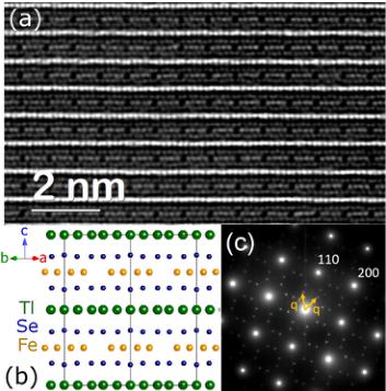 The crystals were observed to be chemically homogeneous and fully ordered via aberration corrected scanning TEM (STEM) using high angular annular dark field (HAADF) imaging. The STEM image shown in Fig. 1(a) was taken with the electron beam parallel to the [110] direction of the supercell. As a result of this orientation, all of the Fe vacancies are aligned in columns parallel to the electron beam and can be readily viewed as dark spots separated by four iron columns. A crystal structure drawing corresponding to the HAADF image is shown in Fig. 1(b) to highlight this ideal vacancy ordering, and the atomic layers are labeled for ease of viewing. Specimens viewed along [001] also revealed an ordered and uniform vacancy superstructure, and a selected area diffraction pattern from this orientation is shown in Fig. 1(c). The selected area diffraction pattern shows two sets of \( \sqrt{5}a \times \sqrt{5}a \) superstructure reflections, indicated by the vectors q and \( q' \) , due to twinning along the (110) subcell planes. Images of the partially disordered crystals can be found in Ref. [35]. STEM data reveal the disordered regions contain Fe vacancies (modulations in Fe HAADF intensity), and thus these regions are not like the vacancy free phases being reported in the superconducting analogues.