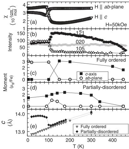 FIG. 2. (a) Magnetic susceptibility of oriented single crystals reveals a change in the easy magnetic axis near 100 K. (b) The integrated neutron diffraction intensity (in counts) for the vacancy order (020) peak demonstrates a saturation of the vacancy ordering at high temperature. The integrated intensity of the (1-21) peak is proportional to the c axis component of the moment, and the (105) peak gains intensity when the moment has an ab plane component; together, these magnetic peaks reveal a change in moment orientation near 100 K. (c) Projections of the refined moments onto the ab plane and c axis for fully ordered crystals and in (d) the same is shown for partially ordered crystals. (e) The c lattice parameters obtained by x-ray diffraction.